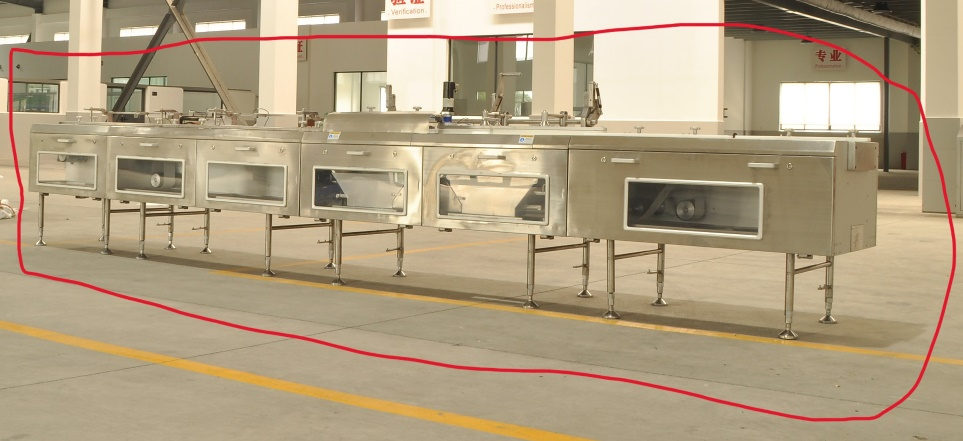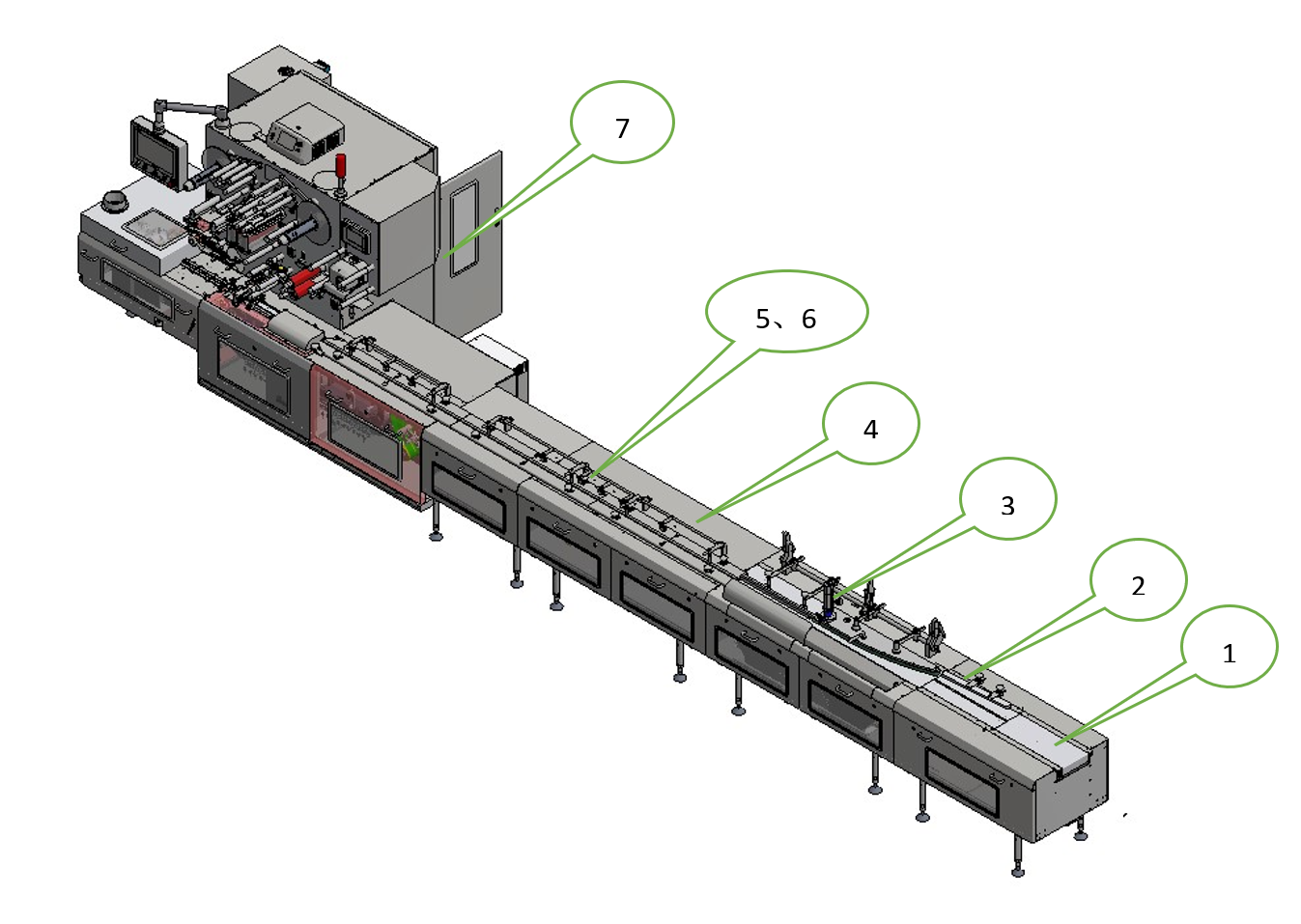 5. Vacuum Belt: Sections 5 and 6 consist of two groups of vacuum belts. By utilizing negative pressure air ducts beneath the belts and small holes on the belt surface, products are securely adsorbed onto the belts. This achieves precise positioning. After two stages of precise spacing adjustment, the products are steadily transferred to the dual-belt system.